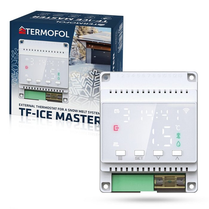 TF-ICE MASTER je moderný externý termostat určený na ovládanie systémov proti námraze a snehu. Pracuje na základe externých snímačov teploty a vlhkosti (predávané samostatne), ktoré monitorujú aktuálne poveternostné podmienky. Na základe údajov termostat automaticky spúšťa alebo vypína vykurovací systém, čím optimalizuje spotrebu energie a zvyšuje bezpečnosť okolia.