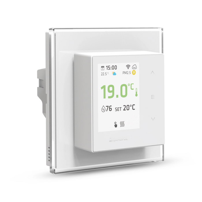Termostat TF-H7 WiFi poskytuje presnú kontrolu vykurovania, zároveň zobrazuje informácie o počasí, kvalite ovzdušia (PM 2.5) a je vybavený aj snímačom vlhkosti. Vďaka farebnému displeju a možnosti diaľkového ovládania cez WiFi ponúka maximálny komfort a úsporu energie. Je kompatibilný s aplikáciami TERMOFOL Smart, čo umožňuje jednoduché a efektívne riadenie vykurovania.