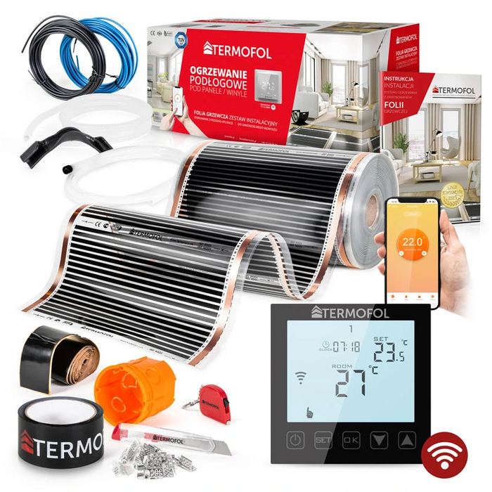 Súprava vykurovacej fólie o šírke 100/50 cm a výkone 220 W/m² s príslušenstvom a termoregulačným zariadením TF-WIFI BLACK