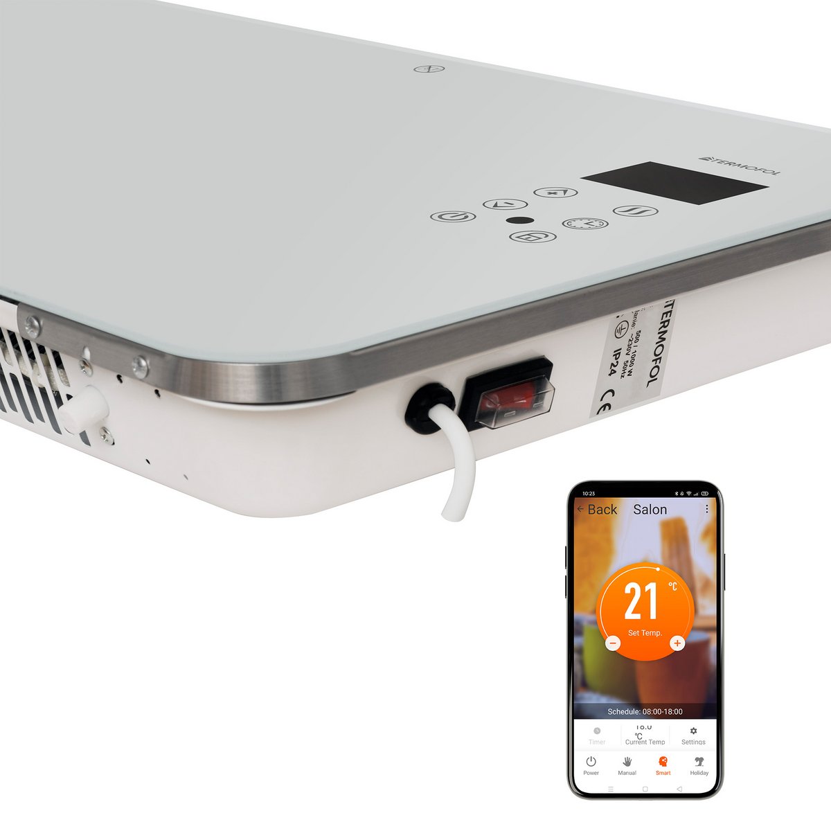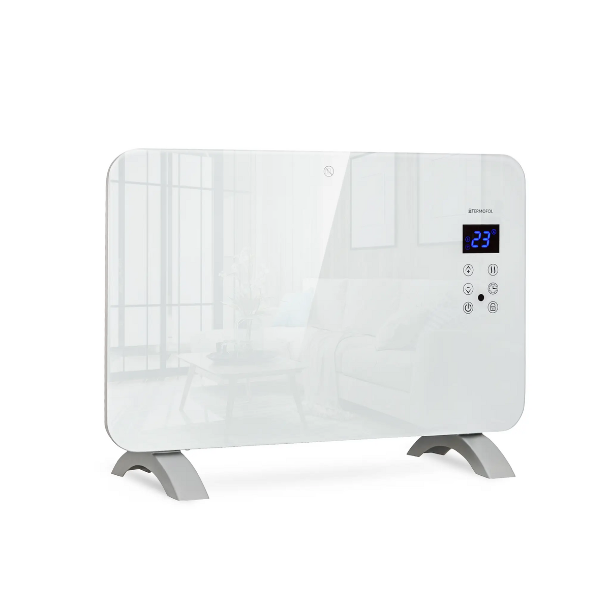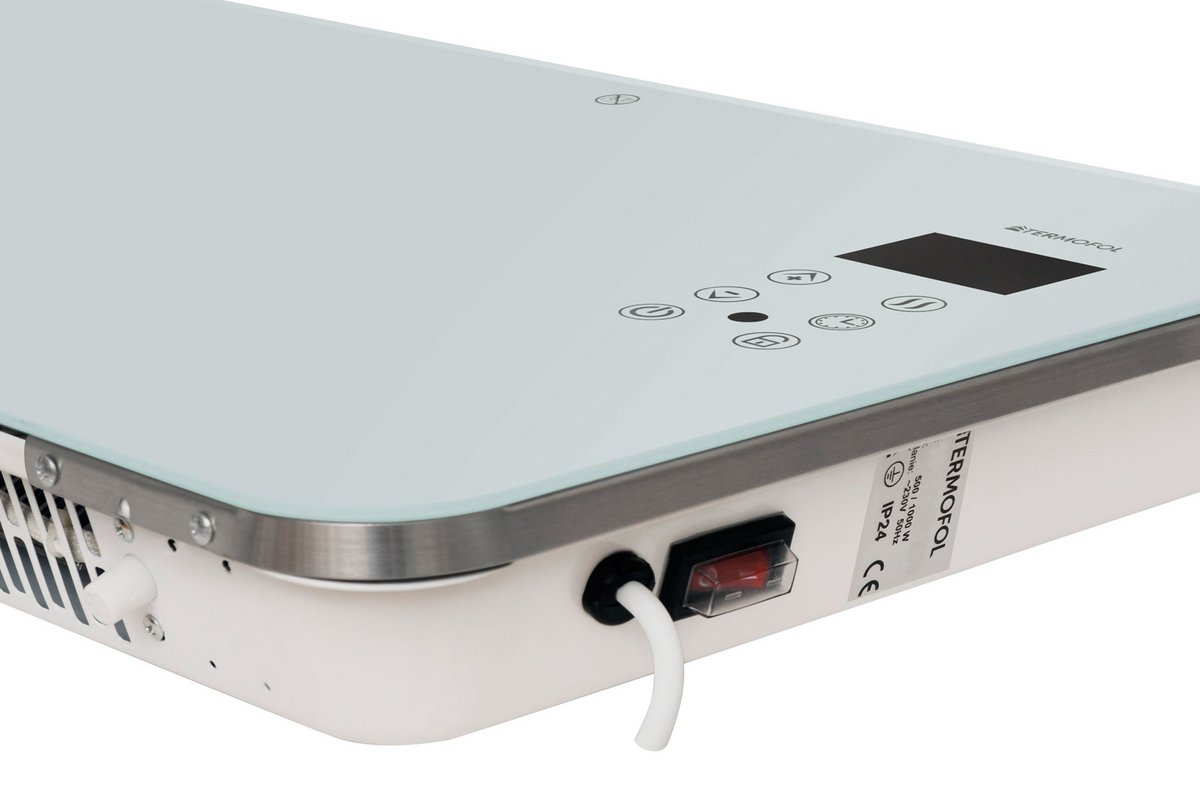 Predná časť je vyrobená z kvalitného tvrdeného skla. Ohrievač je vybavený dotykovým digitálnym termostatom s LCD displejom, ktorý umožňuje presné nastavenie teploty.