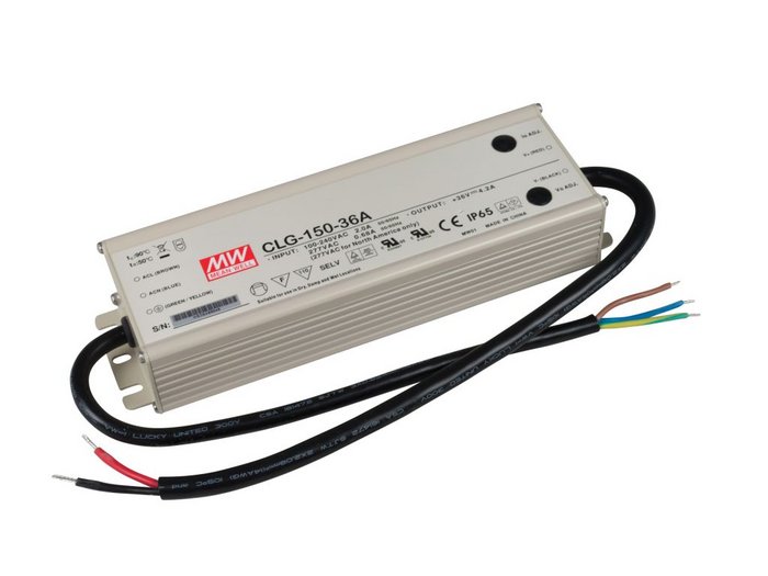 Impulzný zdroj s krytím IP65 a PFC, výstupné parametre je možné nastaviť pomocou trimrov.
