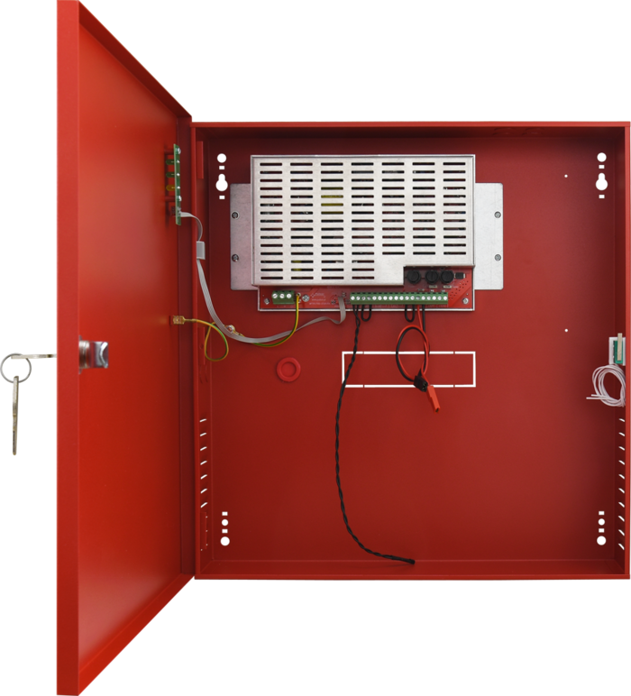 Napájací zdroj s výstupom 27,6 V DC / 5 A. Zdroj spĺňa normu EN 54 a stupeň krytia IP 30. Výstupy: porucha siete AC a všeobecná porucha. Výstup napájania: 4,2 A / 27,6 V DC na nepretržitú prevádzku, 5 A / 27,6 V DC na dočasnú prevádzku. Priestor pre zálohové akumulátory 2x TP 12-18 (akumulátor nie je súčasťou balenia). Vyhotovenie kov, farba červená (RAL3001), rozmery 385 x 402 x 88 mm.