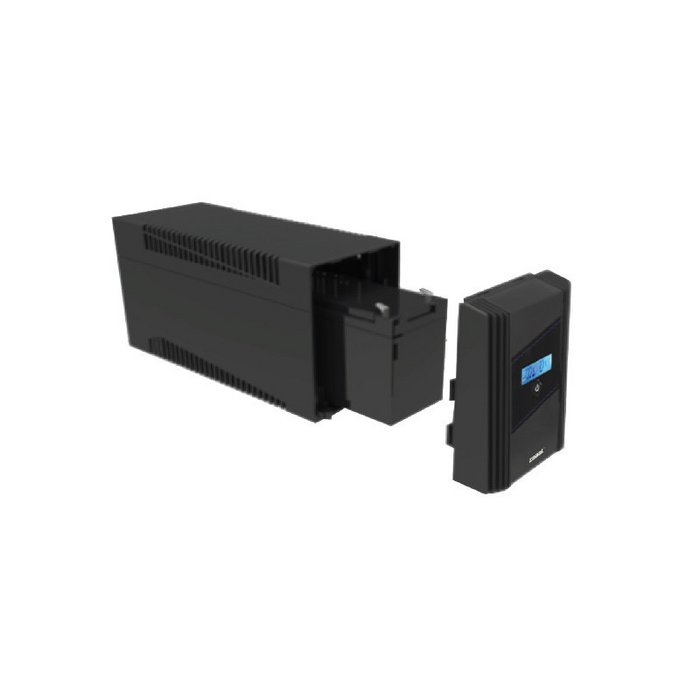 záložný (Off line) zdroj UPS 230VAC s výkonom 650VA (380W),1x výstup 230V zásuvka, 1x akumulátor 12V/7Ah(súčasť balenia), s displejom, rýchlosť nábehu max. 10ms, ochrana proti úplnému vybitu, ochrana proti skratu na výstupe, možná konfigurácia softvérom cez USB, prevedenie tower (stolové- čierna farba), rozmery 100x140x292mm, hmotnosť 5kg,